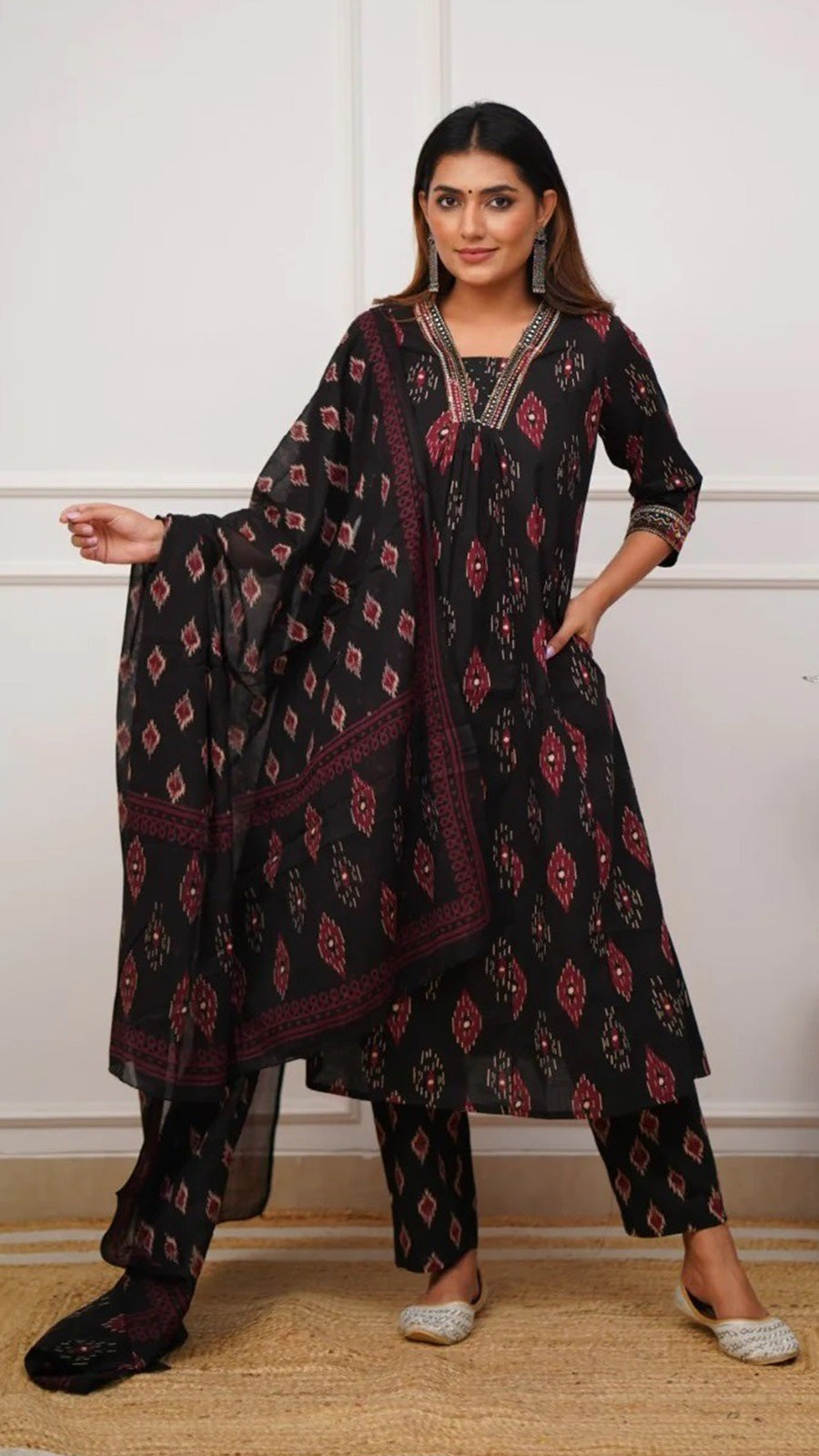Tatav by Sri Patola Black Printed Straight Kurta With Trousers & Dupatta